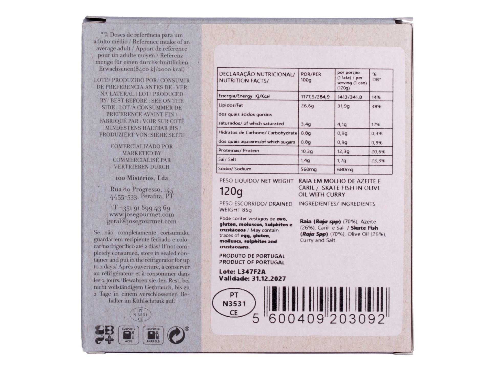 A nossa conserva ABC+ de raia em azeite virgem extra de primeira qualidade e caril perfumado introduz uma adição rara e deliciosa ao mundo dos mariscos enlatados.