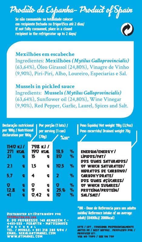 Os mexilhões ATI MANEL trazem uma companhia irresistível: o alho, a cebola, o azeite, o vinagre, o tomate… combinados num delicioso molho de escabeche picante, contribuem, definitivamente, para uma escolha excelente.