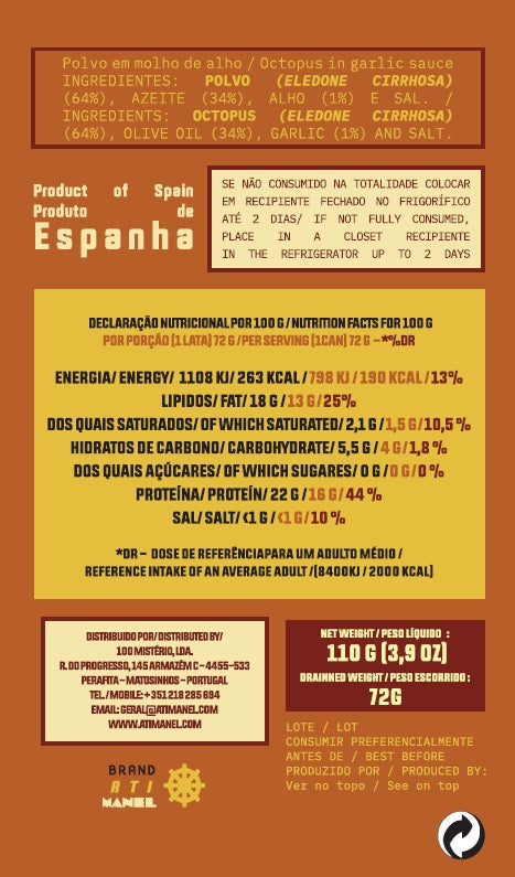 Rico em sabor, o polvo em molho de alho ATI MANEL ajuda a manter os níveis de triglicerídeos e colesterol normais. Auxilia no desempenho físico, em esportes, por exemplo, pois sua concentração de aminoácidos auxilia na regeneração muscular e celular. Ajuda a manter o coração em excelente funcionamento. Além de obviamente ser delicioso…