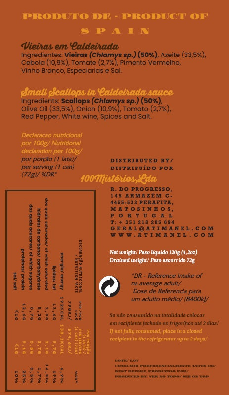As Vieiras em Caldeirada ATI MANEL possuem baixo teor de gorduras, são ricas em proteínas, possuem ácidos graxos, entre os quais o ómega 3, e grande oferta de sais minerais, além de serem deliciosas, claro.