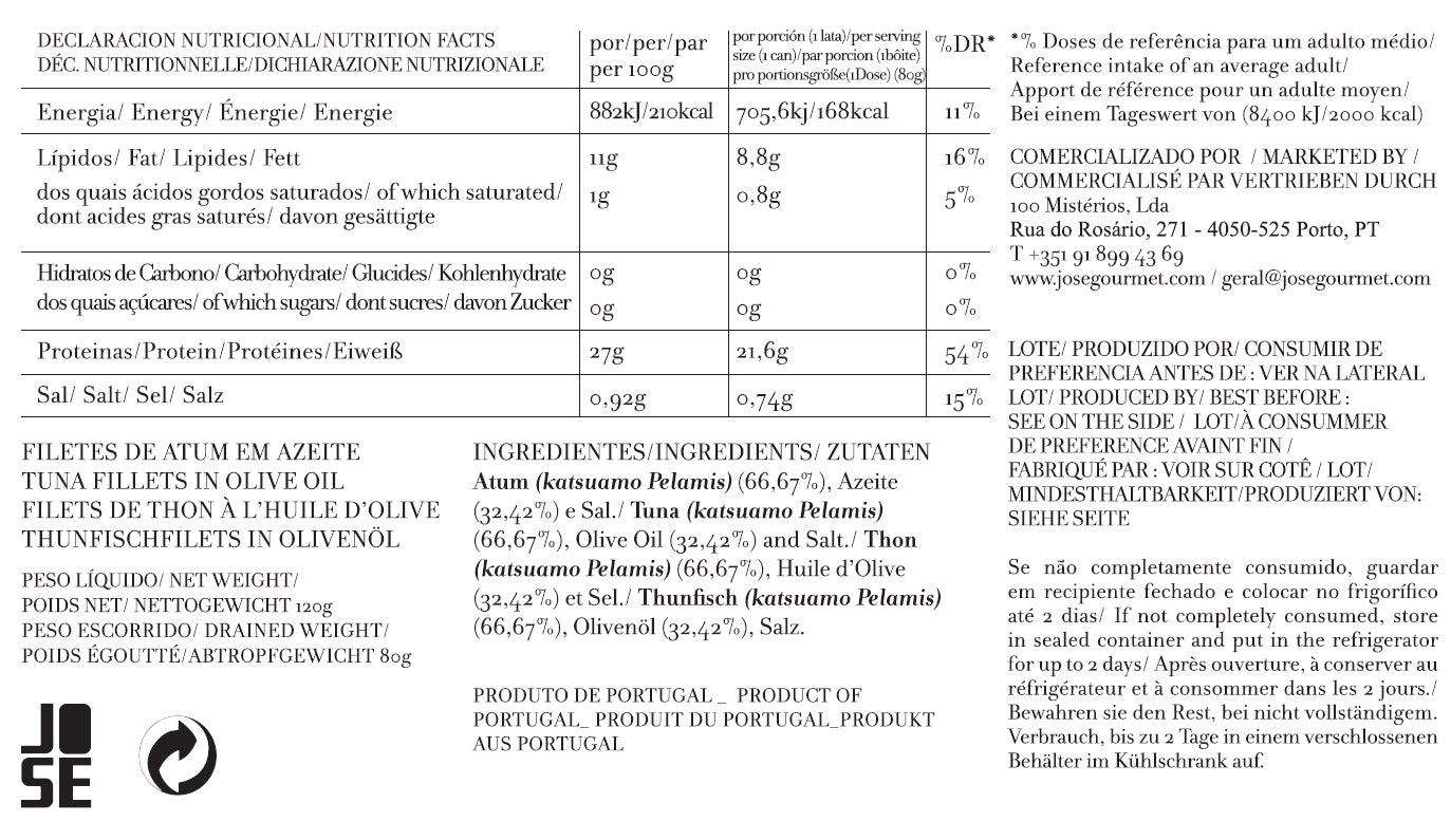 A Ventresca de Atum em Azeite JOSÉ GOURMET concentra uma maior quantidade de gordura, apresentando uma textura mais cremosa e um sabor mais rico. O atum ocupa um lugar especial na dieta mediterrânica, sendo uma fonte de proteínas, lípidos, vitaminas e sais minerais.