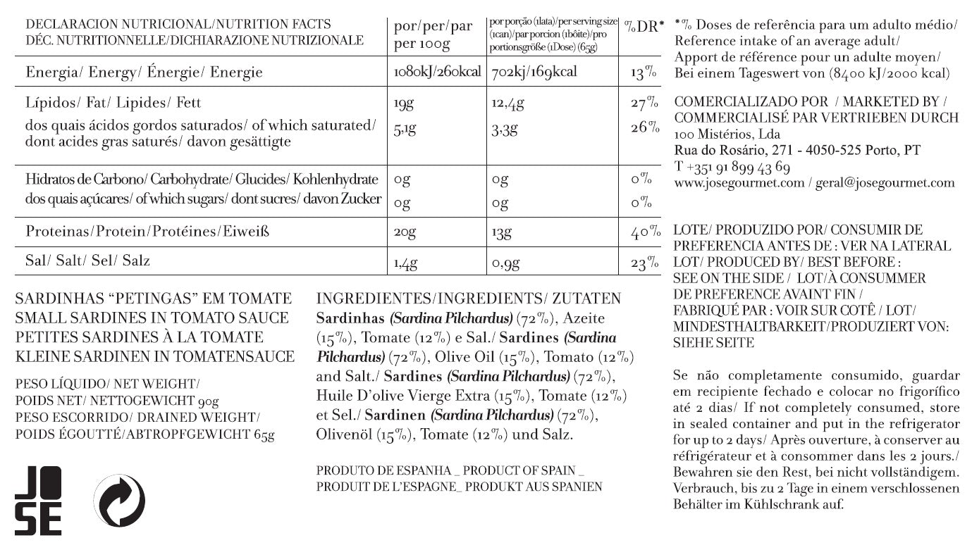 As Petingas em Tomate JOSÉ GOURMET são provenientes do Atlântico e do Mediterrâneo, as petingas são cuidadosamente preparadas e condimentadas com azeite e tomate, básica combinação de poderoso sabor. Sem quaisquer conservantes, aromatizantes ou corantes, mas rico em antioxidantes, este produto é garantidamente equilibrado nos nutrientes.