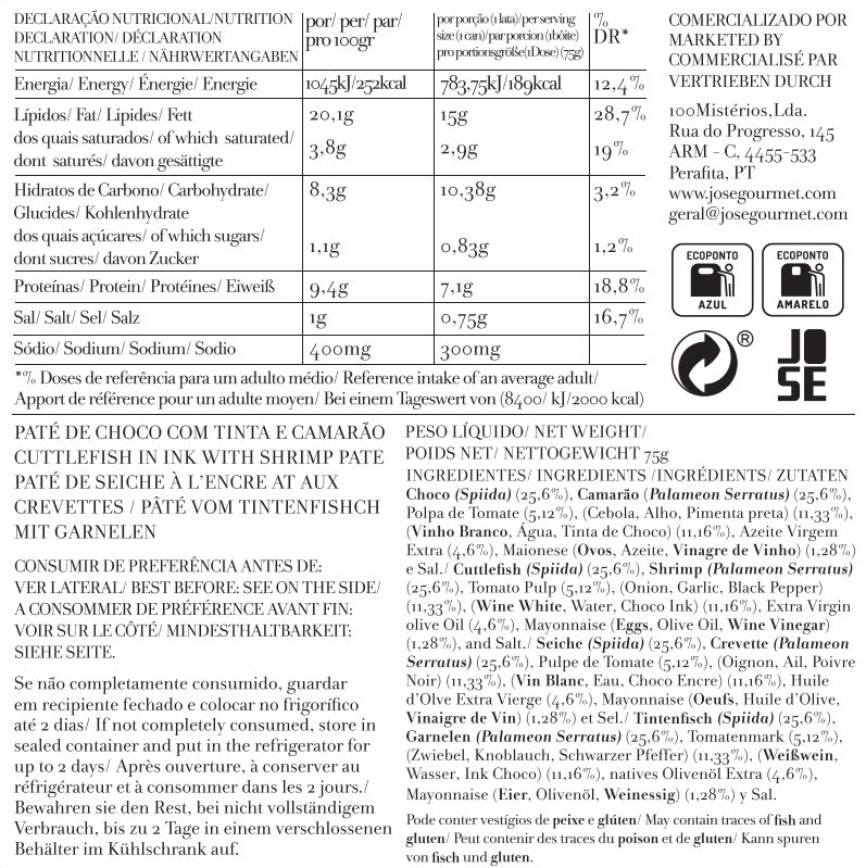 O patê de choco com tinta e camarão JOSÉ GOURMET é uma iguaria marinha de não se perder, apresentada como um patê cremoso e saboroso. É feito com ingredientes como choco, camarão, tinta de choco, tomate, vinho, azeite, cebola, alho, e especiarias como pimenta e sal.