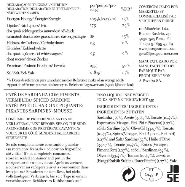 O Patê de Sardinha Picante JOSÉ GOURMET é condimentado pela pimenta branca e pelo piripiri, o tempero deste paté, à base de azeite, tomate e vinagre, oferece uma alternativa ligeiramente picante do paté de sardinha.